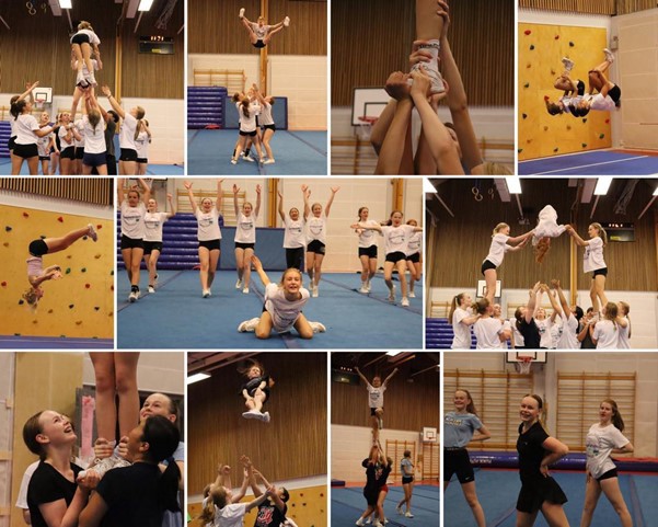 Dag 1 – Fokus på grunnleggende stunting og kroppsposisjoner, der pyramider, tick varianter, dans og acro var fokusområder.