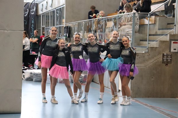 Hallen åpnet for publikum og billettsalg klokken 09.00 og tribunen fylte seg raskt opp. Vi hadde også besøk av Cheermania og Happy Cheerbows som stilte med ulike klubbeffekter, cheersko, sløyfer og div. Noe som var svært populært, både for store og små utøvere samt foreldre og besøkende. I år var det spesielt et strutteskjørt fra cheermania som ble trendy. Her ser dere noen av våre junior utøvere som gladelig poserte til våre fotografer som tok ellers bilder av alle lag på matten.